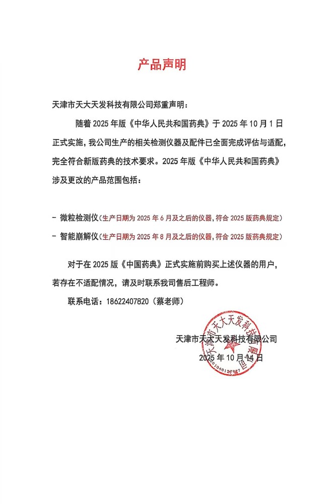 聲 明鑒于2025版《中國(guó)藥典》的更新,為保障天大天發(fā)忠實(shí)用戶(hù)的切身利益,凡在2025年之前購(gòu)置我公司設(shè)備的客戶(hù),若您的設(shè)備未能滿(mǎn)足新版藥典的要求,我們將提供升級(jí)服務(wù)。涉及產(chǎn)品:微粒檢測(cè)儀:GWJ-1···...